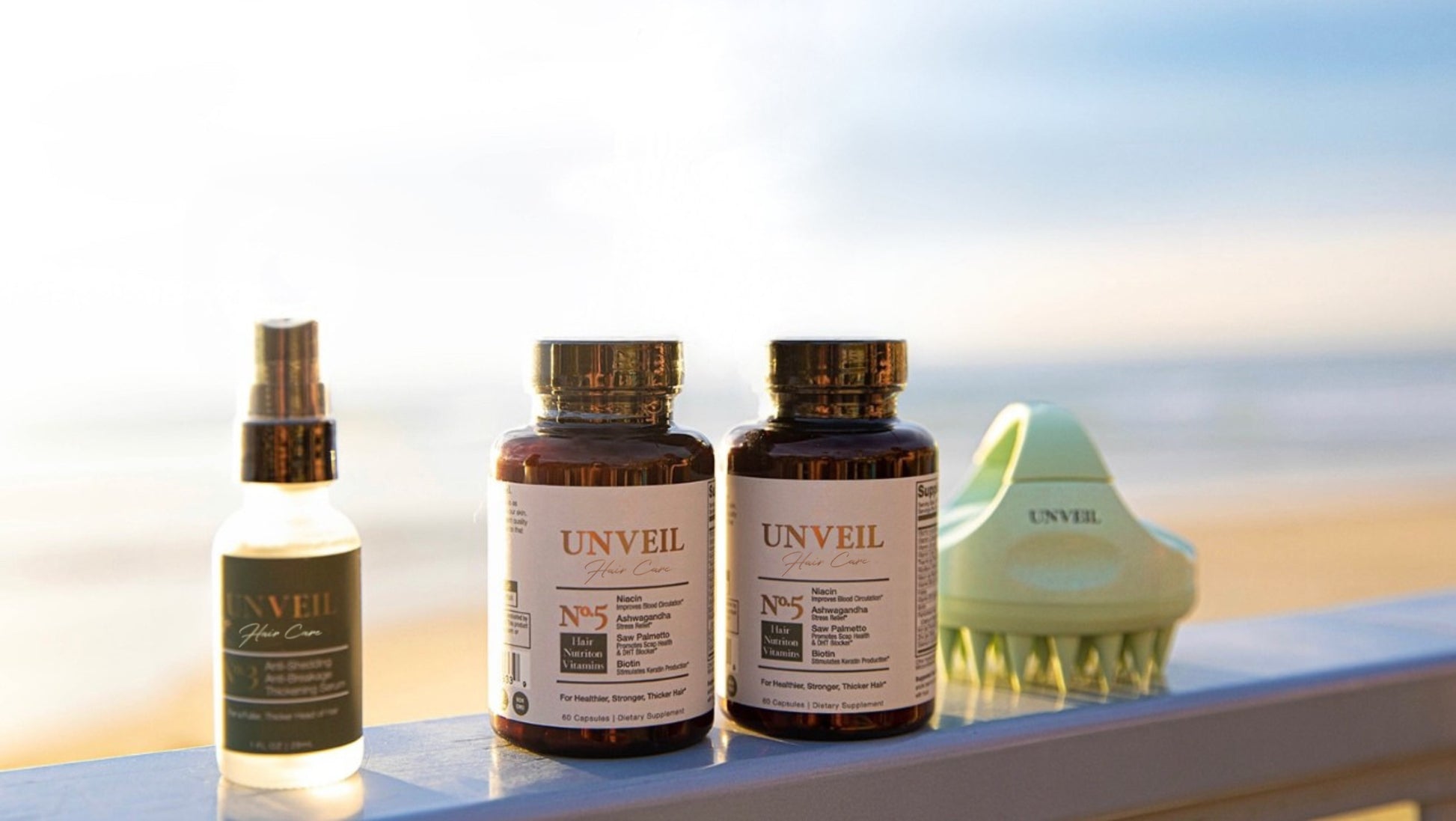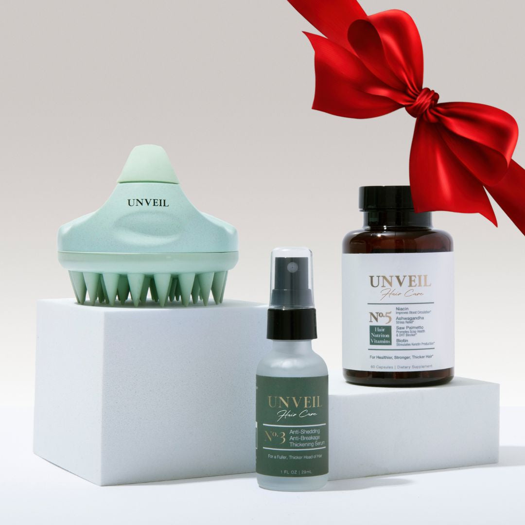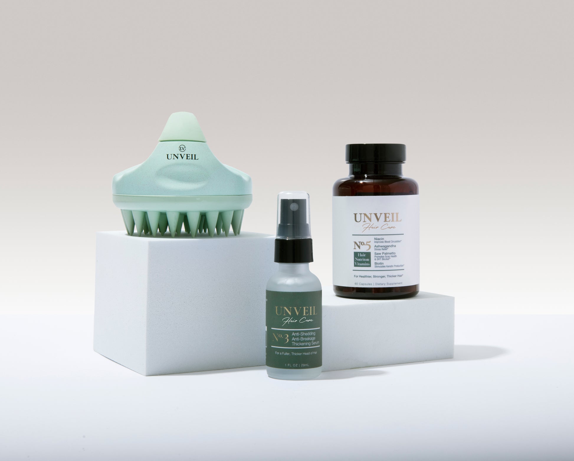 Introducing the Unveil Essentials Kit. A thoughtfully curated trio designed to promote hair growth, scalp health, and stronger, healthier hair from root to tip. This award-winning bundle provides the ultimate foundation for a complete hair wellness routine.