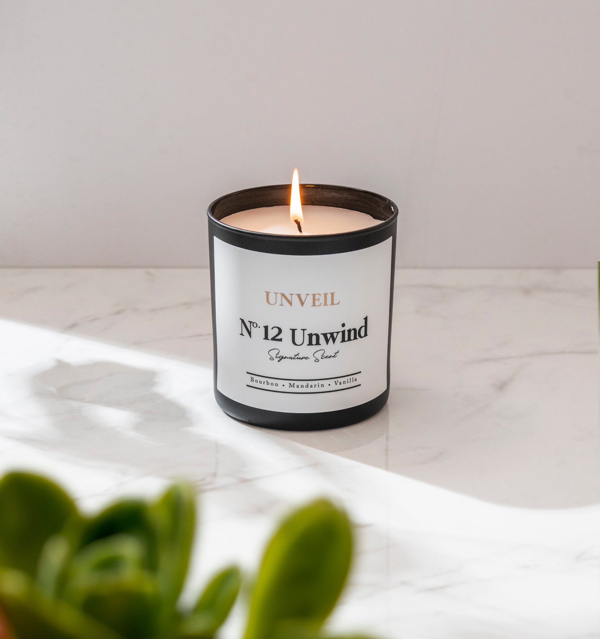 Elevate any space with the Unwind Candle. A luxurious, calming addition to your self-care and wellness routine.