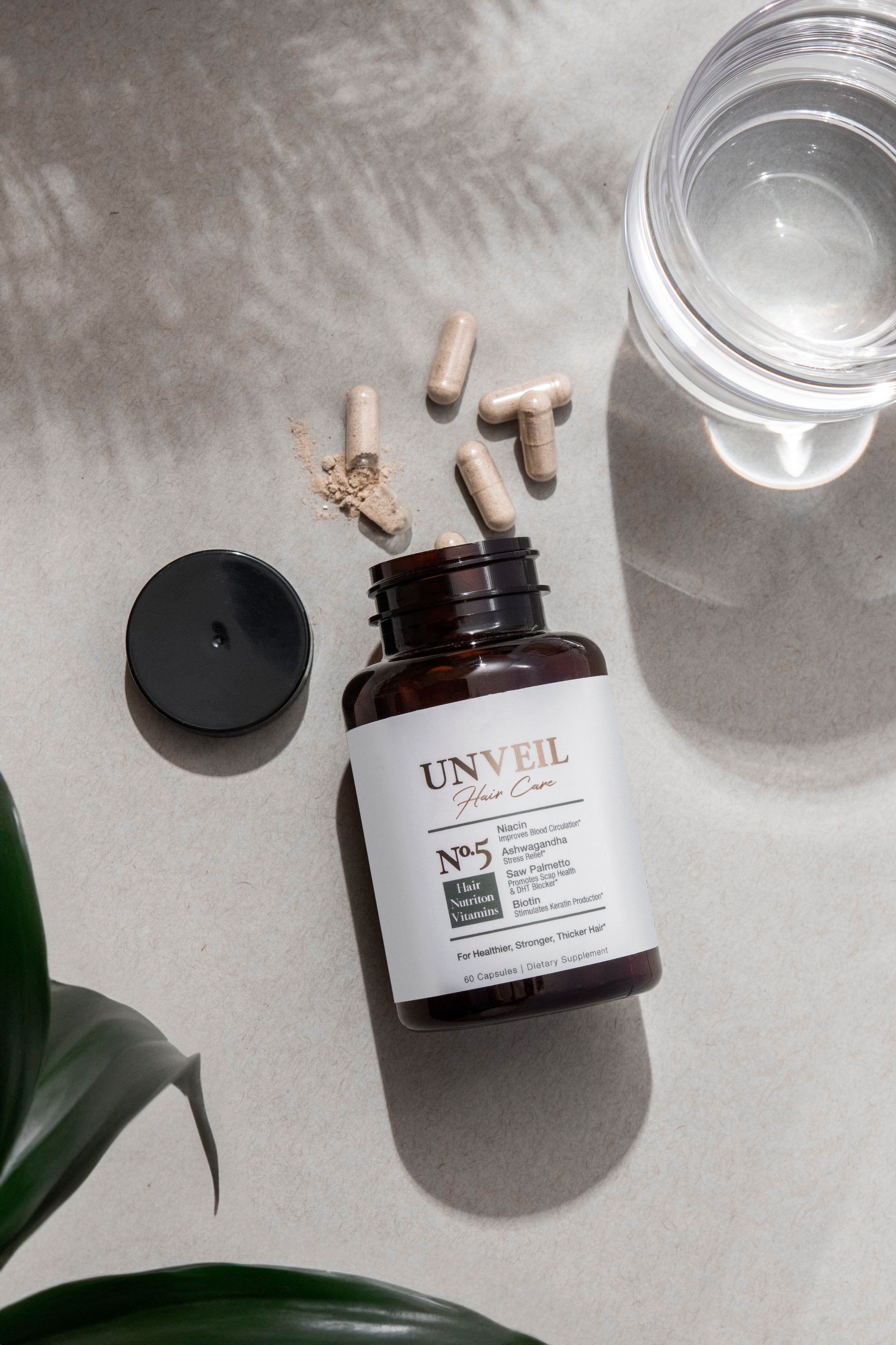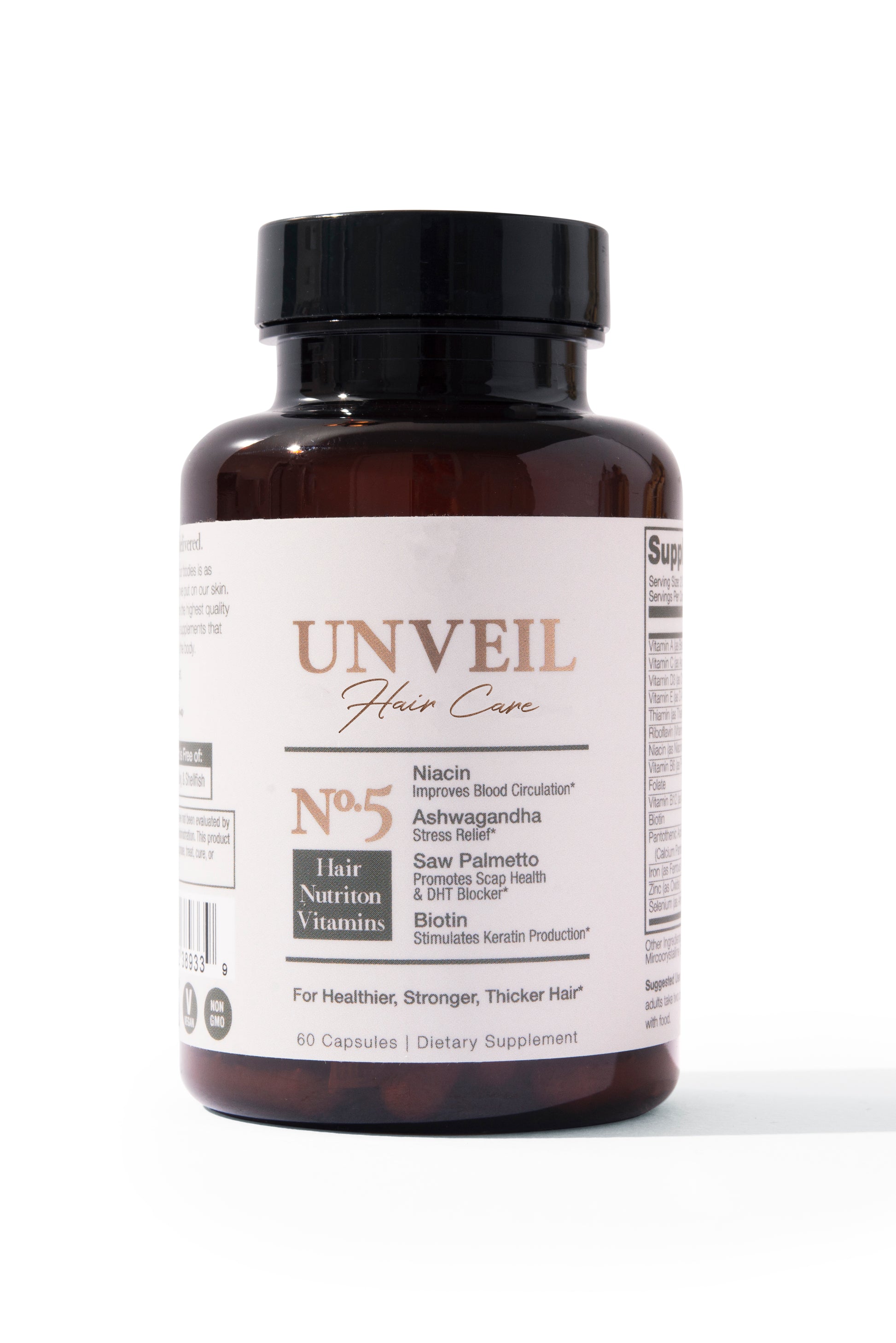 Nourish your hair from the inside out with Unveil N°5 Hair Nutrition Supplements. Our award-winning, proprietary formula supports hair growth, scalp health, and overall anti-aging goals.